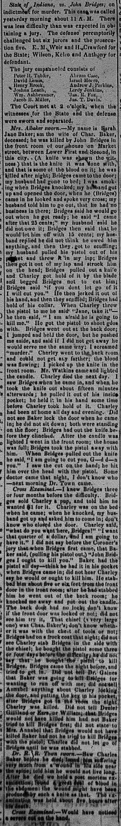 About ten months after the Coroner’s Inquest, the murder trial of John Bridges finally went to court. It was several days of jury selection and testimony, so I’ll break it up into separate posts for ease of access. It’s quite lengthy, but I find it all very interesting. The following articles are the two pre-trial articles and the first day of the trial, which includes the testimony of Sarah Jane Baker (or Albaker), wife of the deceased, and Doctors Town, Clapp, and Naghel.
