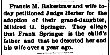 Springer, Mildred Gertrude – adoption – NAET, Fri 25 May 1894, p.3, c.2 Published March 17, 2015 at 466 × 235 in Zerilda Rakestraw: Almost a Ghost (52 Ancestors #11) ← Previous Next → New Albany Evening Tribune, Friday, 25 May 1894, p.3, column 2, NewspaperArchive.com