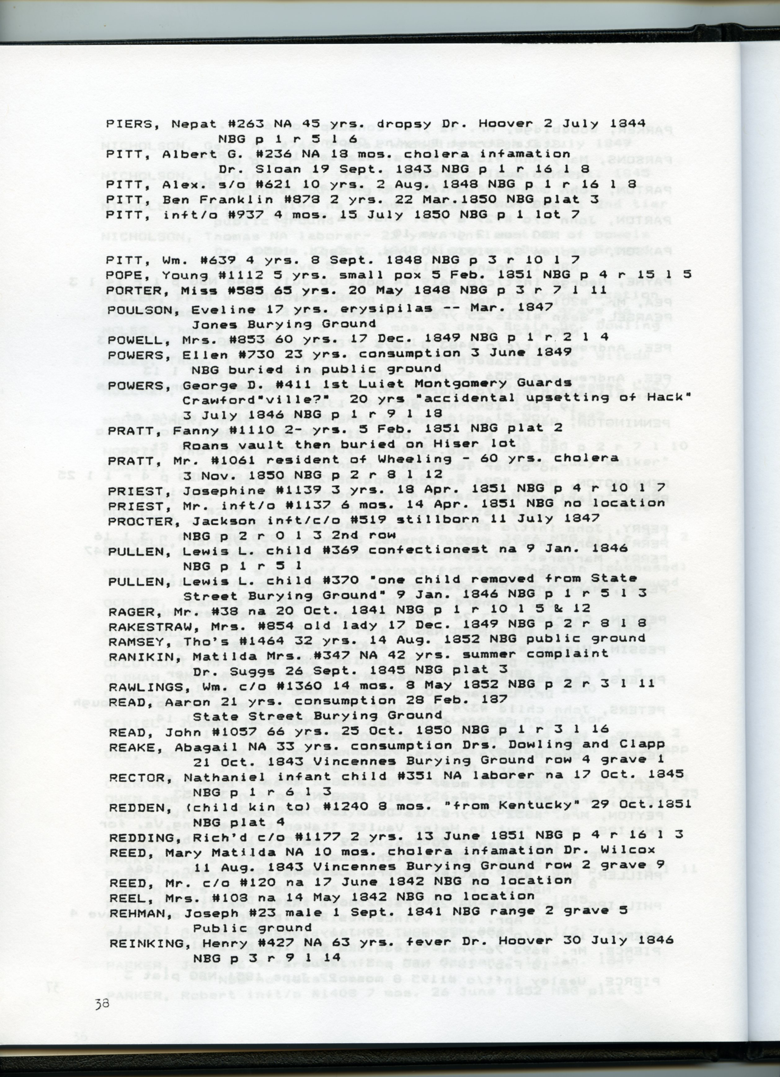 - Ang, William, Marguerite Ang, James Thornton Eiler, Jackie Murray Nance, and Shirley Wolf, comps. Fairview Cemetery: September1, 1852 to November 18, 1865. Vol. 1. New Albany, Ind. (P.O. Box 665, New Albany 47151): Southern Indiana Genealogical Society, 1989. Print. The Indiana Southern Counties Collection. p.62.